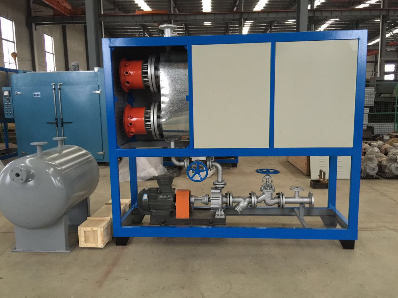 導(dǎo)熱油爐排氣流程: 1、導(dǎo)熱油通過膨脹槽注油口處加注,并通過膨脹口管道流入設(shè)備及油爐本體內(nèi),此時(shí)注油時(shí)一定要打開系統(tǒng)中所有的閥門(放油閥除外),讓導(dǎo)熱油流入筒體及需加熱設(shè)備內(nèi)。 2、當(dāng)液面顯示約為膨脹槽高度1/2時(shí),停止注油。 3、首 行常溫排氣:接通電源,打開導(dǎo)熱油加熱器的進(jìn)出口閥門及排氣閥(膨脹管道閥門需一直開著以及時(shí)補(bǔ)充油量),按動(dòng)油泵啟動(dòng)按鈕,油泵運(yùn)行,油泵應(yīng)按箭頭指示方向正常運(yùn)行,壓力表壓力顯示在規(guī)定范圍內(nèi),視聽油泵運(yùn)行情況,如有異常現(xiàn)象應(yīng)立即停機(jī)檢查,將故障排除后再重新起動(dòng)油泵,進(jìn)行常溫下排氣,直至壓力表指示穩(wěn)定。進(jìn)行常溫排氣時(shí),要注意觀察膨脹槽內(nèi)的液位,當(dāng)?shù)陀谝?guī)定的液位高度時(shí)要及時(shí)進(jìn)行補(bǔ)充。 4、升溫脫水:在確認(rèn)常溫下運(yùn)行正常后,即可進(jìn)行升溫脫水排氣(操作前詳閱導(dǎo)熱油使用說明書及溫控儀使用說明書),升溫脫水排氣可按如下步驟進(jìn)行: 步:升溫至100-120℃保溫 開始升溫時(shí),應(yīng)該控制升溫速度在50℃/h以內(nèi),并且監(jiān)視壓力表顯示是否正常,如發(fā)現(xiàn)無壓力或壓力不穩(wěn),說明系統(tǒng)內(nèi)仍有殘留氣體,此時(shí)要求按3要求重復(fù)進(jìn)行常溫排氣操作,待系統(tǒng)壓力穩(wěn)定后方可繼續(xù),升溫至120℃后進(jìn)行長時(shí)間保溫,保溫時(shí)間的長短與系統(tǒng)總?cè)萘考皩?dǎo)熱油的質(zhì)量有關(guān)。  第二步:升溫至150-180℃保溫。  排除油中輕組分、揮發(fā)物及殘余水分,請參照KRD系列導(dǎo)熱油加熱器系統(tǒng)脫水排氣曲線圖操作 第三步:脫水排氣完成后要關(guān)閉排氣閥(其它閥門無需關(guān)閉),投入正常升溫運(yùn)行。 5、 升溫脫水排氣過程有關(guān)事項(xiàng)。 升溫過程中管路可能會(huì)發(fā)出碰擊的響聲,說明系統(tǒng)內(nèi)有大量氣體或管道不暢,此時(shí)要降低升溫速度,待氣體排除便可消除聲響;如系管道不暢所至應(yīng)予以排除。 脫水排氣過程可能會(huì)有大量氣體涌入膨脹槽,造成槽內(nèi)導(dǎo)熱油外溢,操作前要在溢油管下安置好溢油容器。 進(jìn)行脫水排氣時(shí),現(xiàn)場必須有人員看守,發(fā)現(xiàn)異常及時(shí)處理。   對于所提的油泵無油或少許油流出的問題,解決方案如下: 1、 關(guān)閉出油口閥門,啟動(dòng)油泵,觀察壓力表顯示情況,若無壓力,則說明回油口無油補(bǔ)充油泵,使得油泵空轉(zhuǎn),無后續(xù)油及時(shí)補(bǔ)充,則請貴司檢查一下回油口的供油情況,此時(shí)請確保膨脹槽里有油并膨脹管道閥門打開和需熱設(shè)備有油并出油口閥門在打開狀態(tài)。 2、 如果以上要求都執(zhí)行到位,壓力表還無壓力,請檢查油爐上的油泵、截止閥及過濾器是否堵塞。 3、 若壓力表顯示壓力值,而油泵、截止閥及過濾器并無堵塞,那油爐的出油口一定會(huì)按油泵所提供的流量進(jìn)行流出。